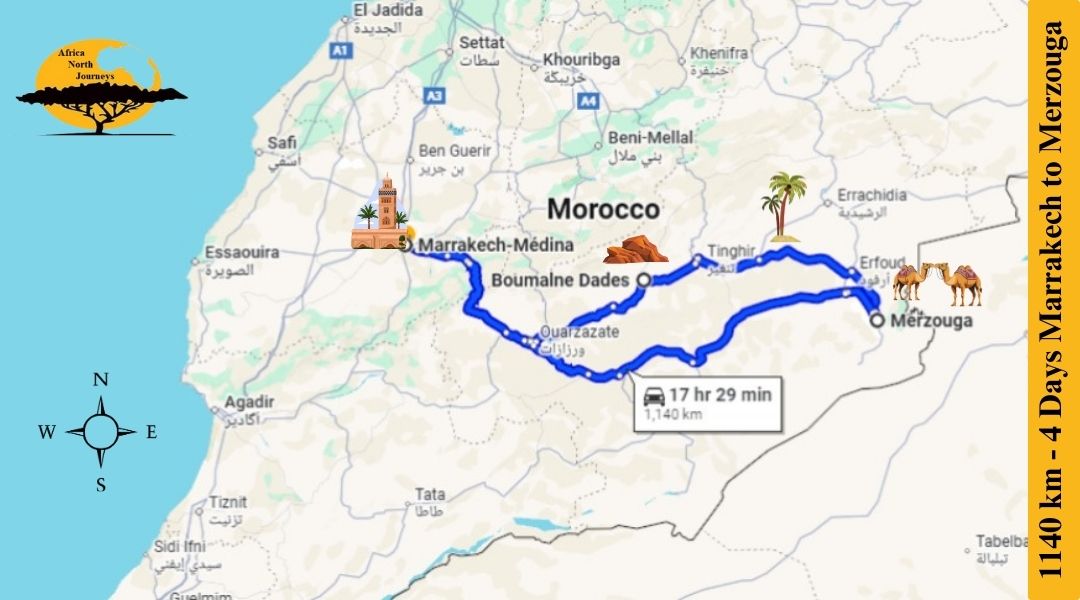 The distance between Marrakech, the Red City, and the mesmerizing golden dunes of Merzouga is approximately 558 km. However, if you book this tour, the journey will be comfortably divided with an overnight stay in Boumalne Dades, ensuring a smoother and more enjoyable travel experience.