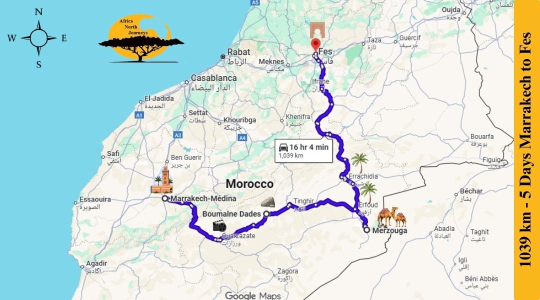 The drive from Marrakech to Merzouga usually takes 8 to 10 hours, but the 5-day tour breaks the journey into comfortable segments with scenic stops along the way. You’ll visit the High Atlas Mountains, Kasbah Ait Ben Haddou, Ouarzazate, Rose Valley, and the Dades Gorge before arriving in the Sahara. This makes the journey enjoyable and avoids long, direct driving.