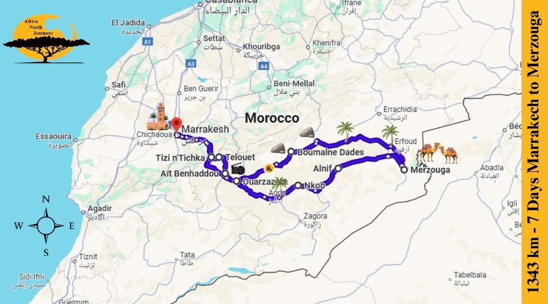 Our 7 Day Morocco tour includes Marrakech, Ait Ben Haddou, Ouarzazate, Dades Valley, Todgha Gorge, Merzouga Desert, nomad villages, Rissani Market, and scenic mountain towns and Telouet.