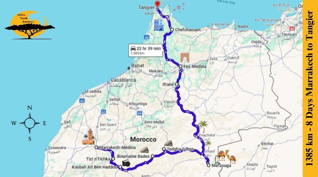 8 Day Morocco itinerary from Marrakech. Immerse yourself in Morocco’s rich tapestry of landscapes and cultures. Starting from the vibrant city of Marrakech, journey toward the mesmerizing desert of Merzouga through the breathtaking High Atlas Mountains, the ancient Ait Ben Haddou Kasbah, and the cinematic city of Ouarzazate. Upon arrival at the golden dunes of Merzouga, enjoy a camel ride and spend an unforgettable night under the stars in a traditional desert camp. After the desert experience, leave Merzouga and head north to the historic city of Fes for two memorable nights. Continue onward to the blue city of Chefchaouen before concluding your 8 Day Morocco itinerary in Tangier.