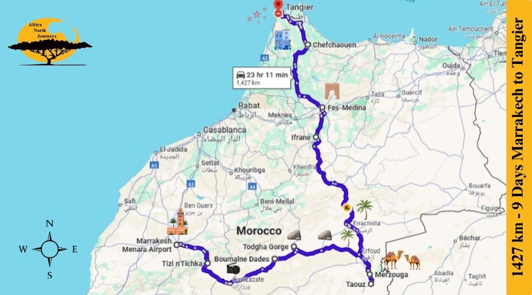 This 9 Days tour from Marrakech, ending in Tangier, offering a complete journey through Morocco’s most fascinating landscapes and cities. Over 9 days and 8 nights, you will discover the country’s rich culture, dramatic scenery, and desert beauty. After landing in Marrakech, a driver-guide from Africa North Journeys will meet you at the airport and transfer you to your riad. A guided city tour introduces you to the highlights of Marrakech, including its historic sites and lively atmosphere.