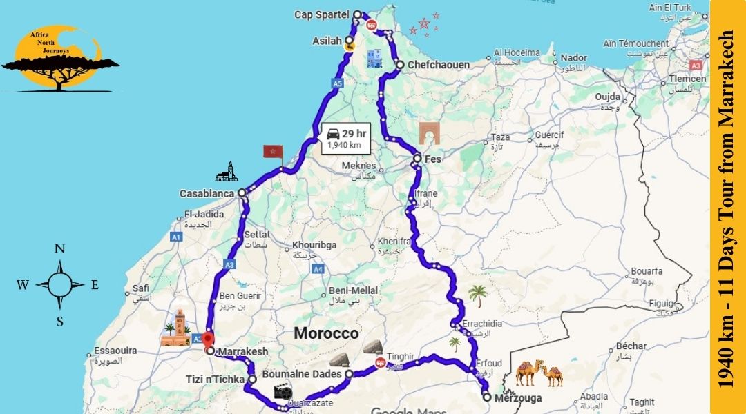 This Morocco itinerary 11 Days from Marrakech is one of the best journeys to book. If you are looking to visit Marrakech and head south to the Sahara Desert via Ait Ben Haddou Kasbah, Dades, and Todgha Gorge, afterward, travel to Fes and Chefchaouen, passing through Meknes, the imperial city of Morocco, and Volubilis. Furthermore, drive to the charming town of Asilah, Rabat, and finally end your 11 days in Morocco in Casablanca.